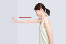 脚は腰幅に開いて、壁に向かって立ちます。次に、腕をまっすぐ伸ばし、片方の手の指の腹で壁を押すように体重をかけます。そのまま20秒間、深呼吸を繰り返しましょう。これを3セット行いましょう。反対の手でも同様に行ってください。