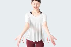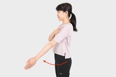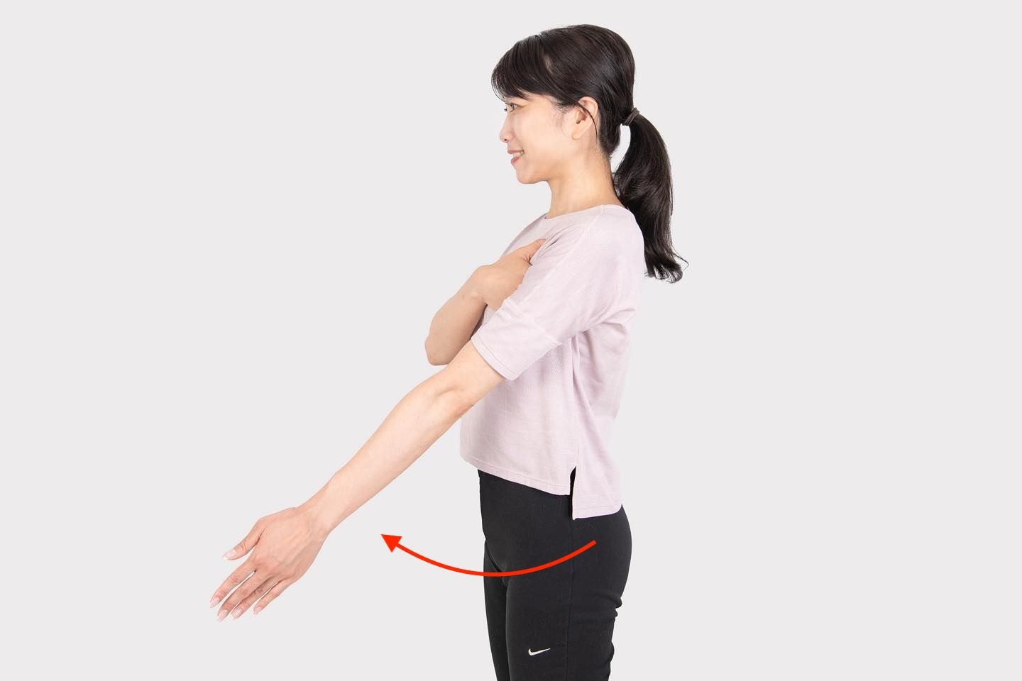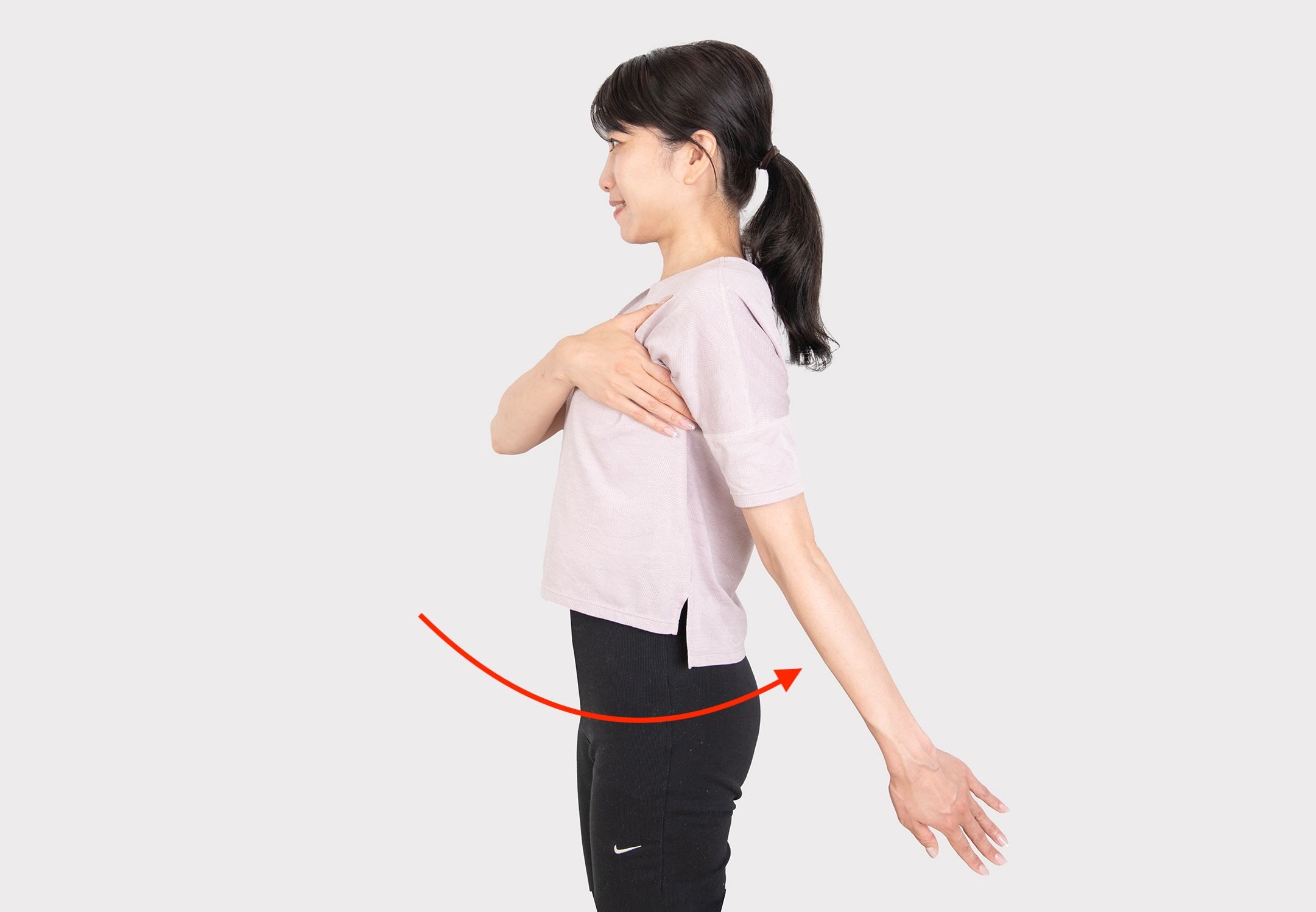 脇の筋肉をぎゅっとつかんだSTEP1の状態で、腕を前後にぶらぶらと動かします。前後で1カウントとして20回行ってください。腕の力は抜いて、深呼吸をしながら行いましょう。反対側も同様に行ってください。