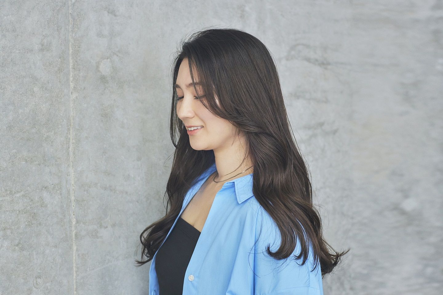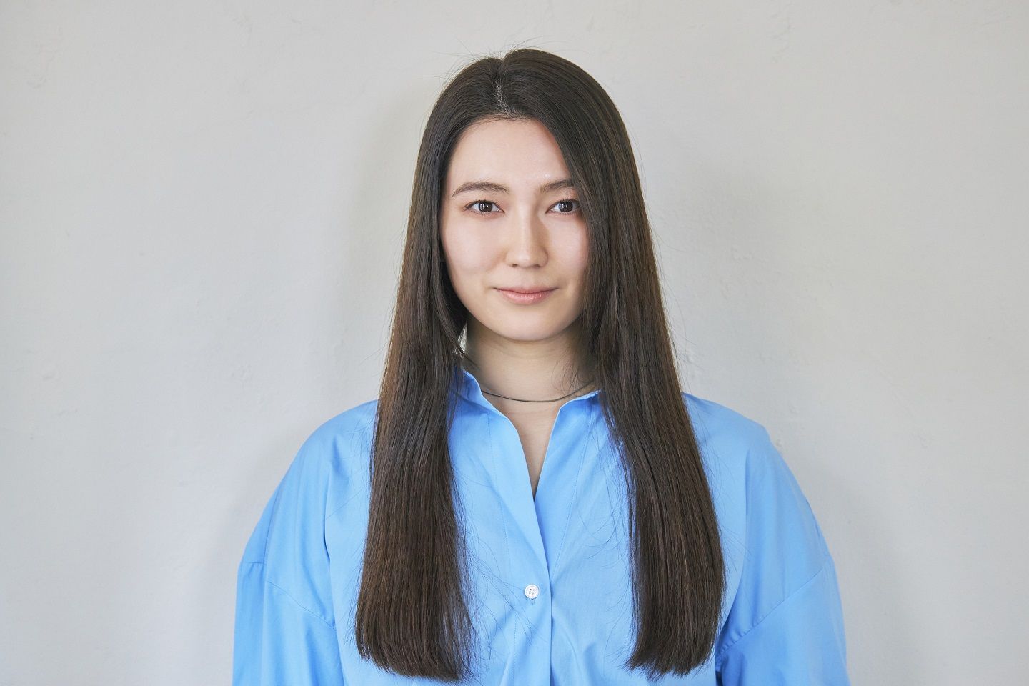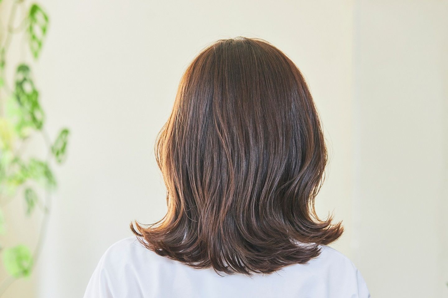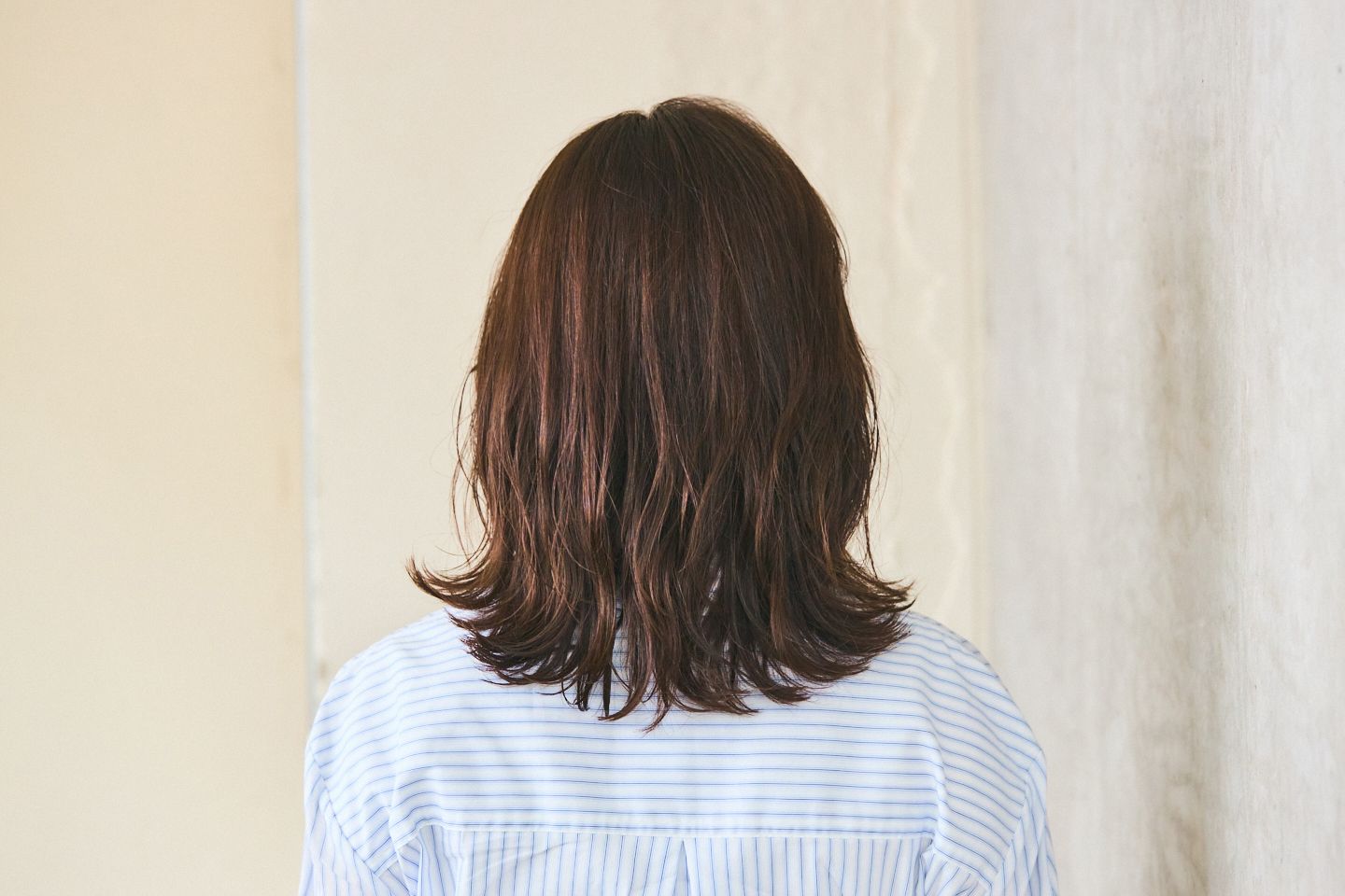 全体的に根元からストレートアイロンを通して面を整えてツヤを出してから、毛先はスッと内巻きに。いったん内巻きに整えておくことで、肩に髪がかかってランダムでナチュラルな動きが出せる。
