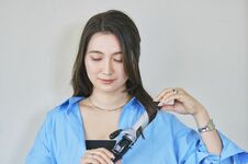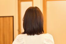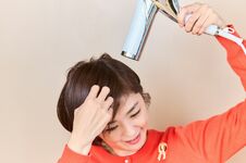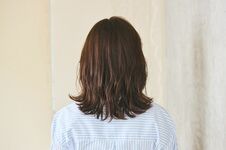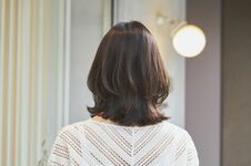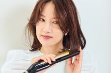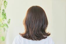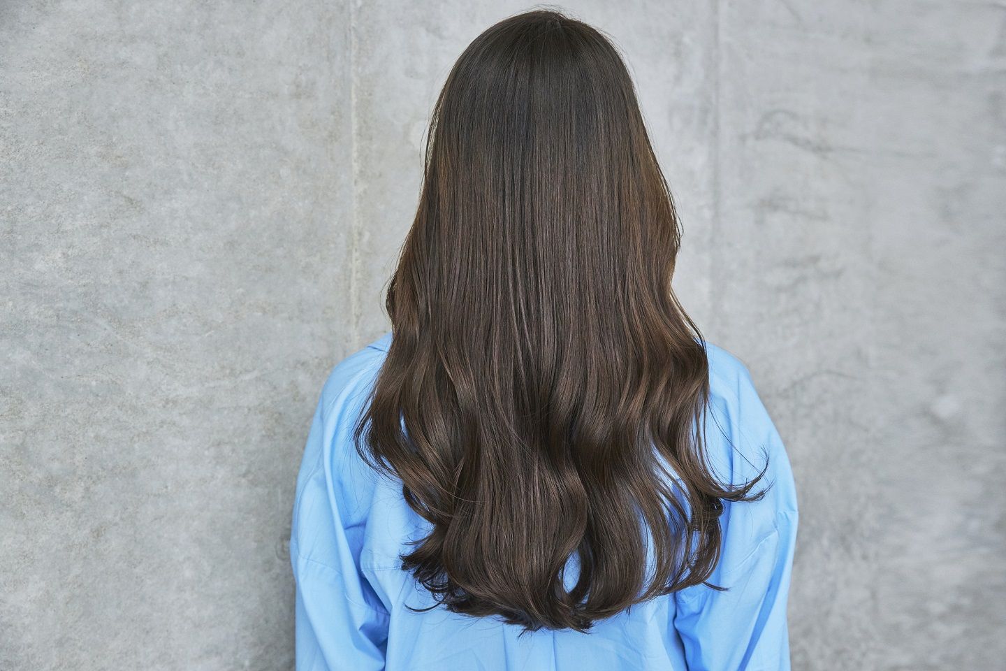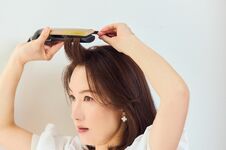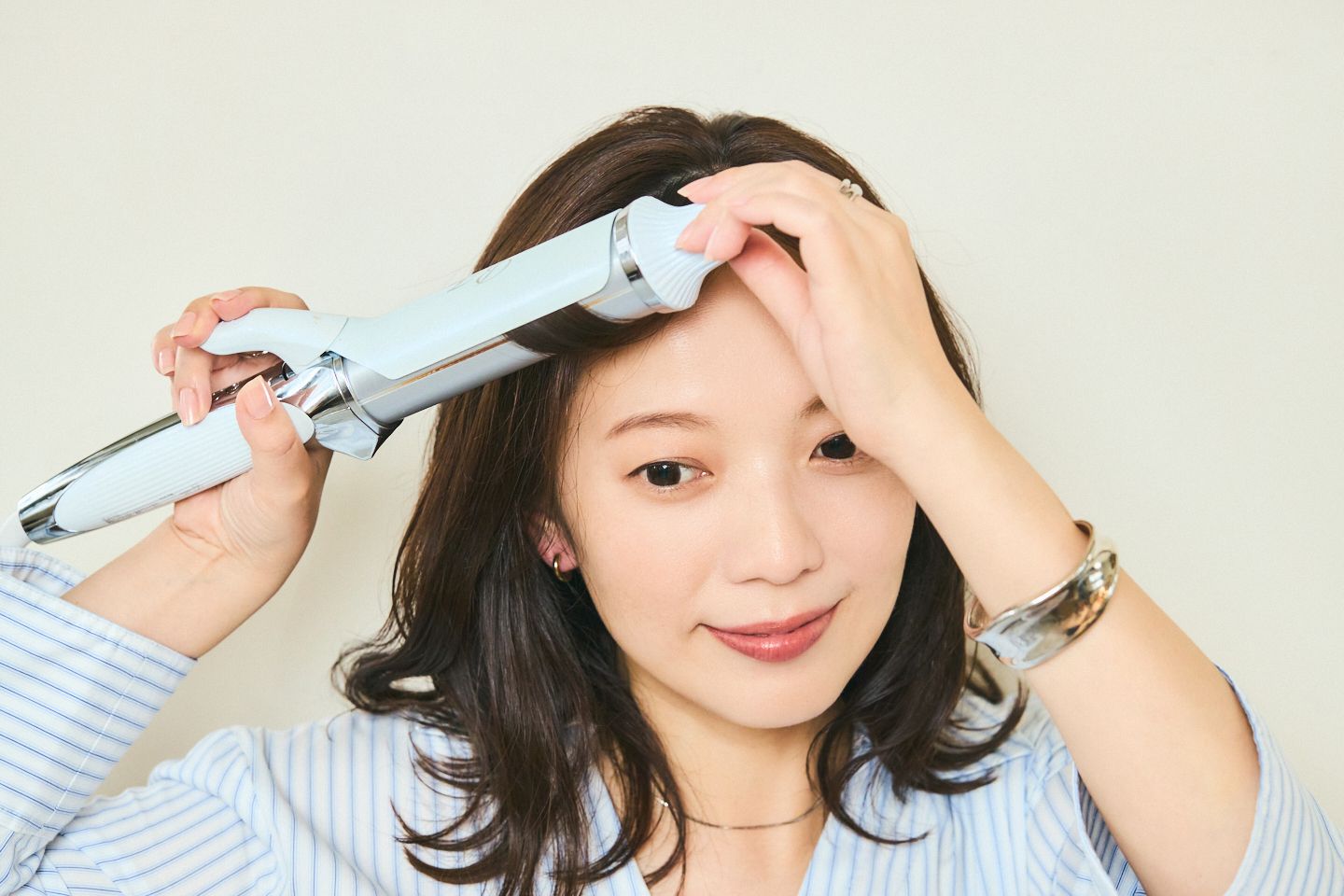 生えグセやペタッとしがちな根元のクセをまずはリセット。頭頂部を軽く濡らしてから、髪を分け目と逆方向に流し、根元にドライヤーの風をあてるように乾かす。その後、まっすぐに髪をおろすことで、ボリュームが自然に出てカットラインもきれいに。アイロンを通す前にこのひと手間を加えることで、よりふわっと美しい毛流れをつくることができる。