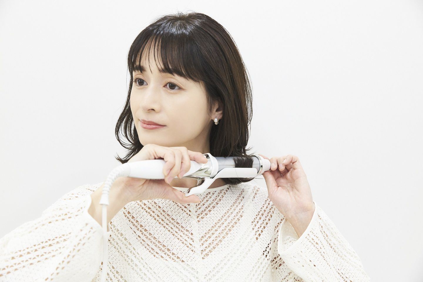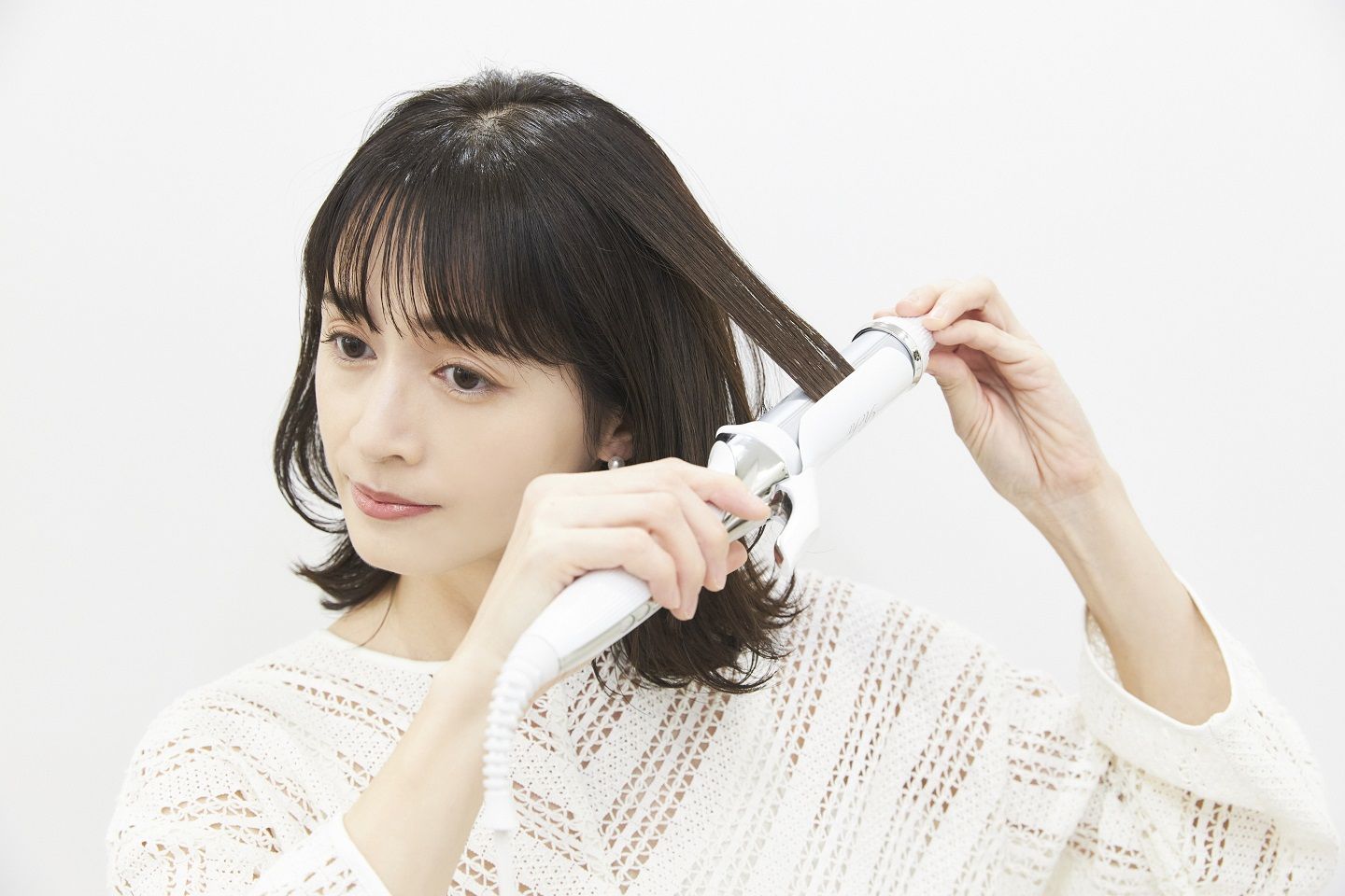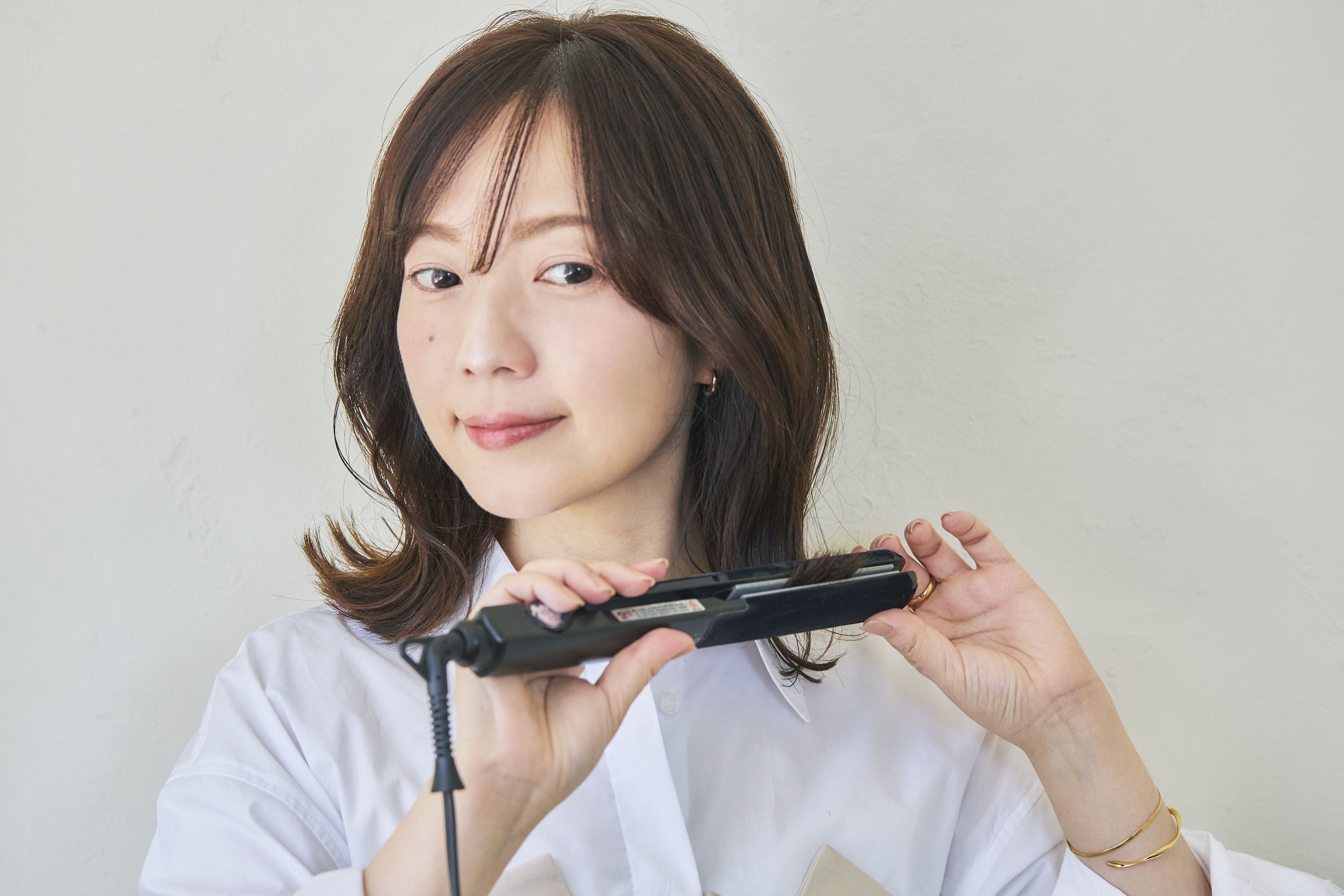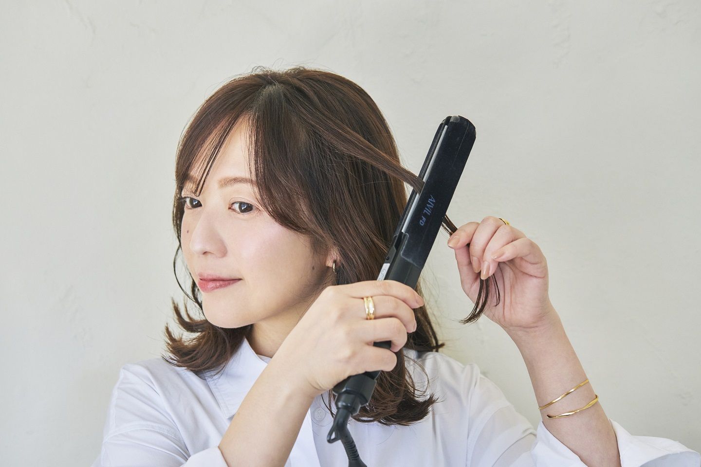 毛先は全体的に、アイロンで外巻きに。自然な印象に見せたいので、太めのアイロンを使って。