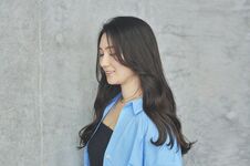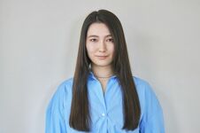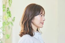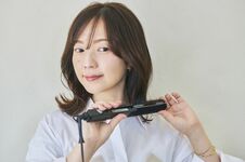 サイドの髪は中間あたりからアイロンを挟み、少しふくらみを持たせるようにしながら斜めうしろに流すように。レイヤーが入った髪にふんわりとしたニュアンスを出し、自然にボリュームアップ。