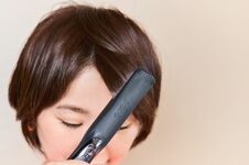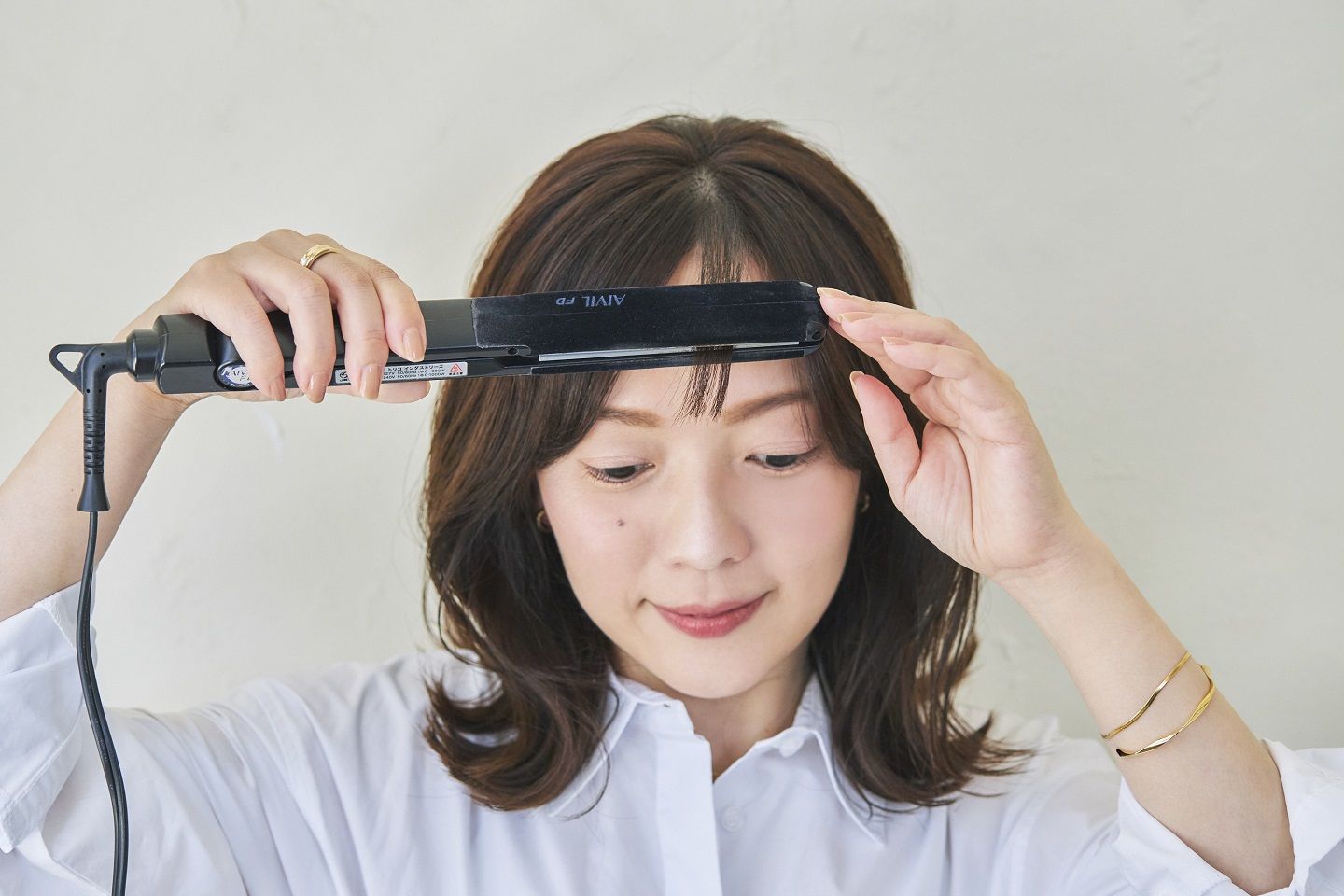 前髪は下にスーッとアイロンを通すだけでOK。ストレートアイロンなら、妙なカールがつくことなく、生えグセを整えることができて手軽。