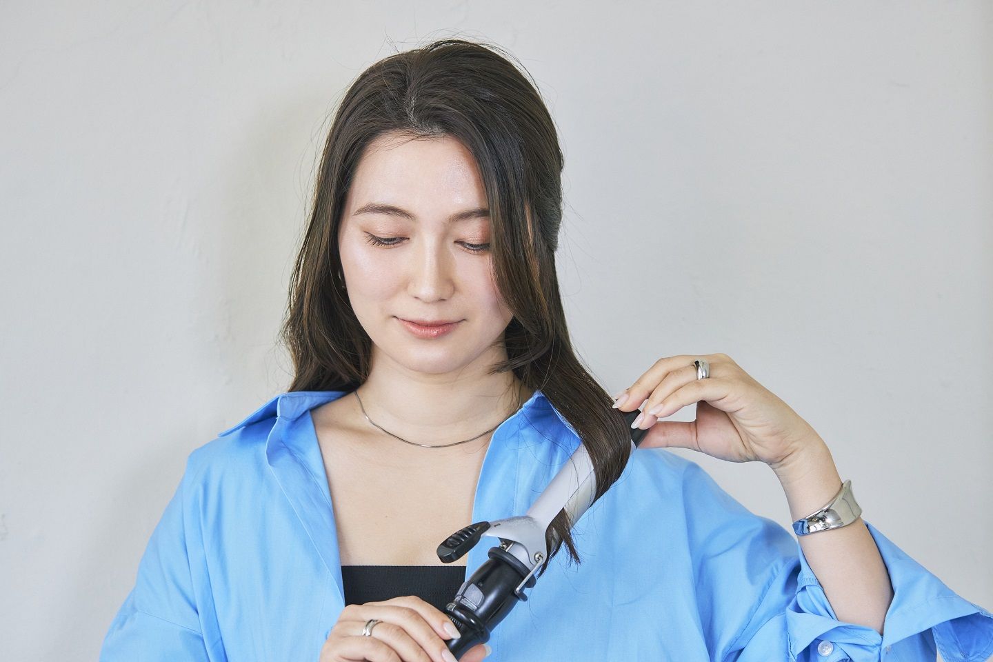 毛先はワンカールの外巻きに。毛先5cmくらいからストレートアイロンを通し、手首を返すようにしてくるっとカールさせて。カールアイロンを使うよりも、ストレートアイロンのほうが毛束がまとまりすぎず自然なこなれたカール感に。