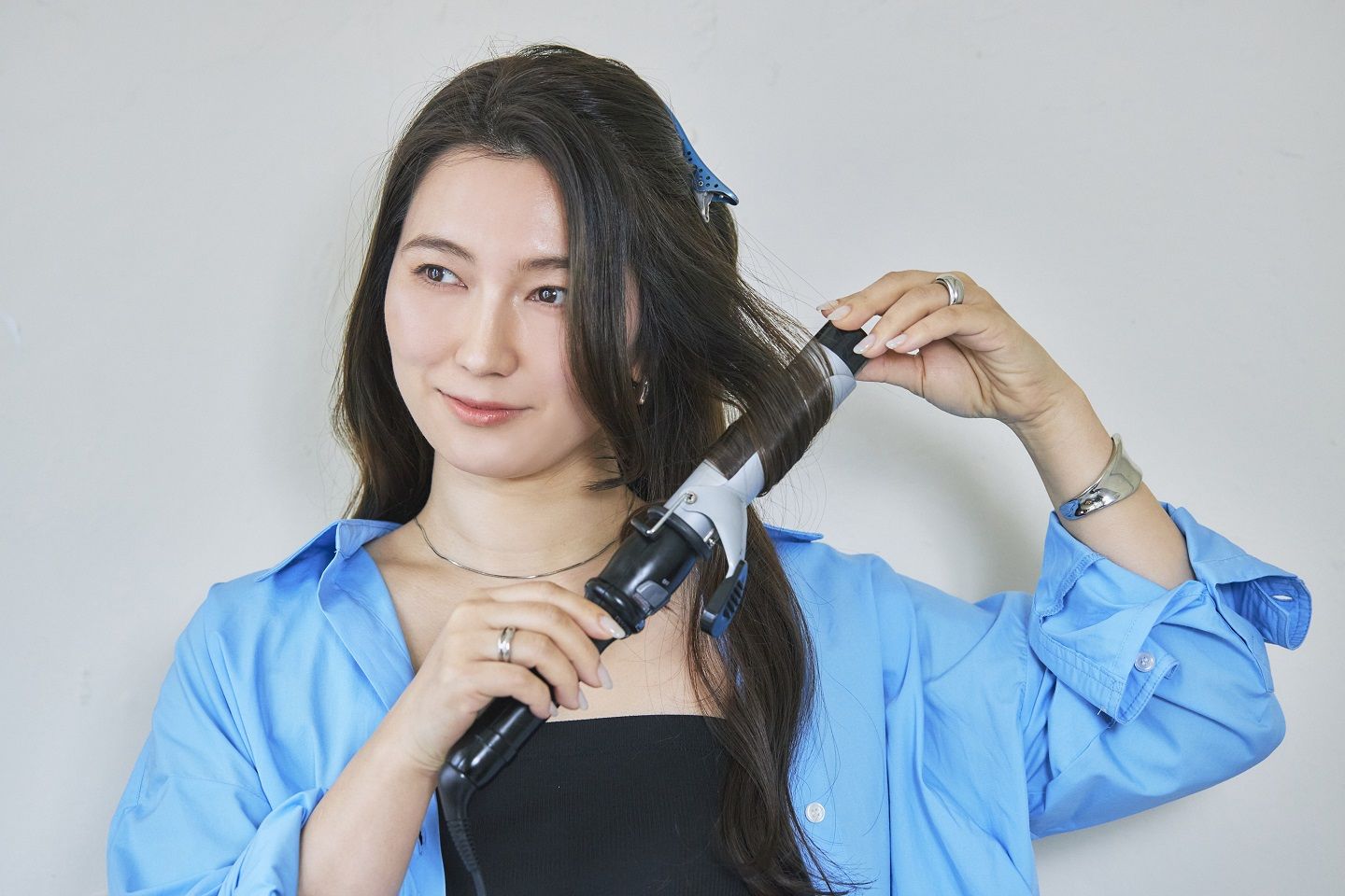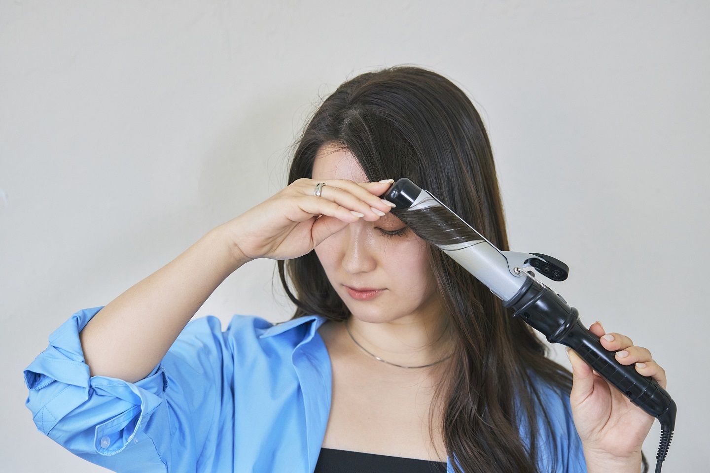毛先はワンカールの外巻きに。38mm以上のやや太めのアイロンを使って、全体的にしっかり巻いていって。