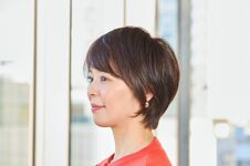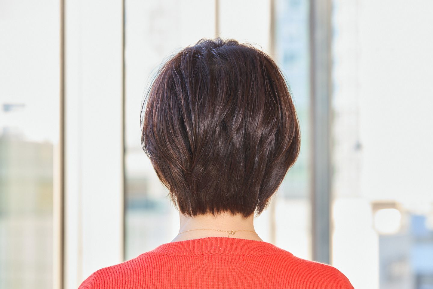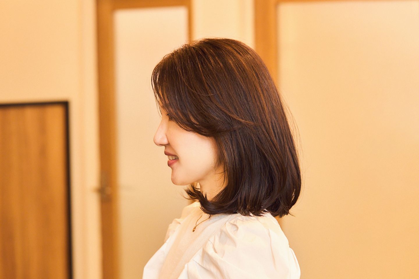 前髪はリバース巻きにして、顔周りにふわりと流すようなシルエットに。こめかみ部分に自然なボリュームができることで、顔の印象もフレッシュに見せる効果が。