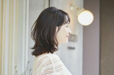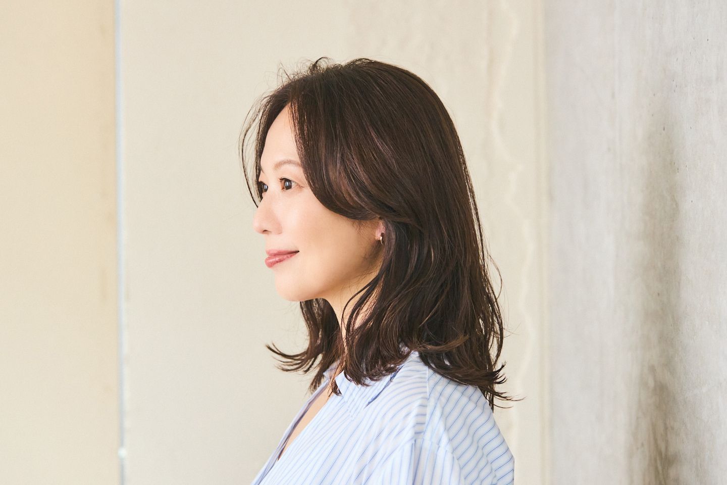 顔周りからサイドにかけては、中間部分を内巻きにニュアンスづけて。S字のくびれをつくることで、より女性らしい柔らかなシルエットに。