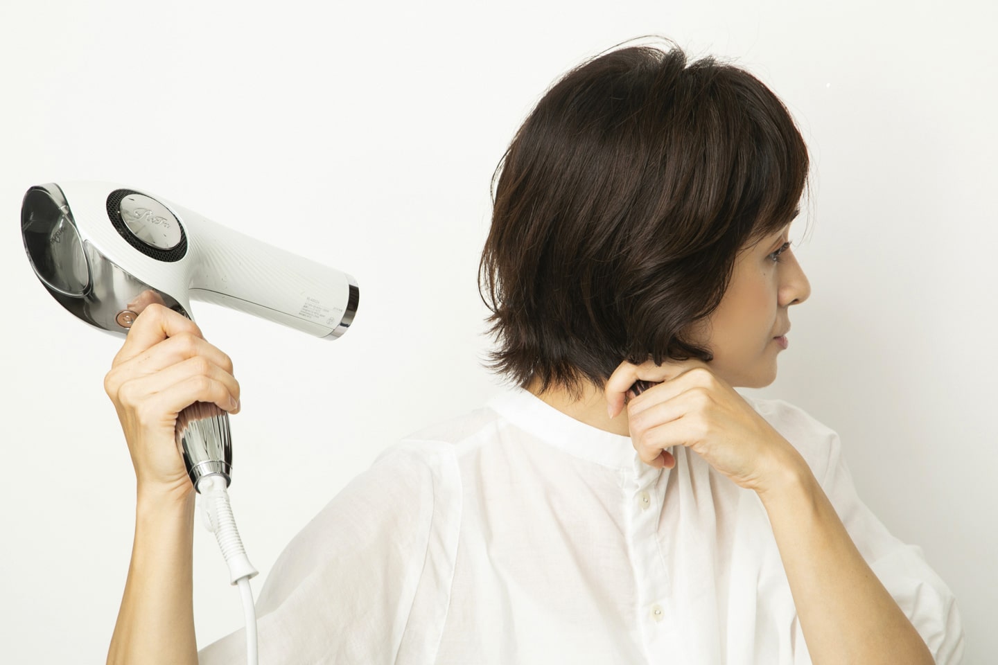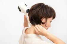 色々な方向から風が当たるように全体をドライ。襟足は首に沿わせるように手でなでつけながら、うしろから前へ乾かす。