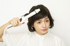 コテは26mmを使用。ハチ前にある毛束の中間を挟み、前に引き出すように動かしながら毛先までスッと熱を通す。逆サイドも同様に。