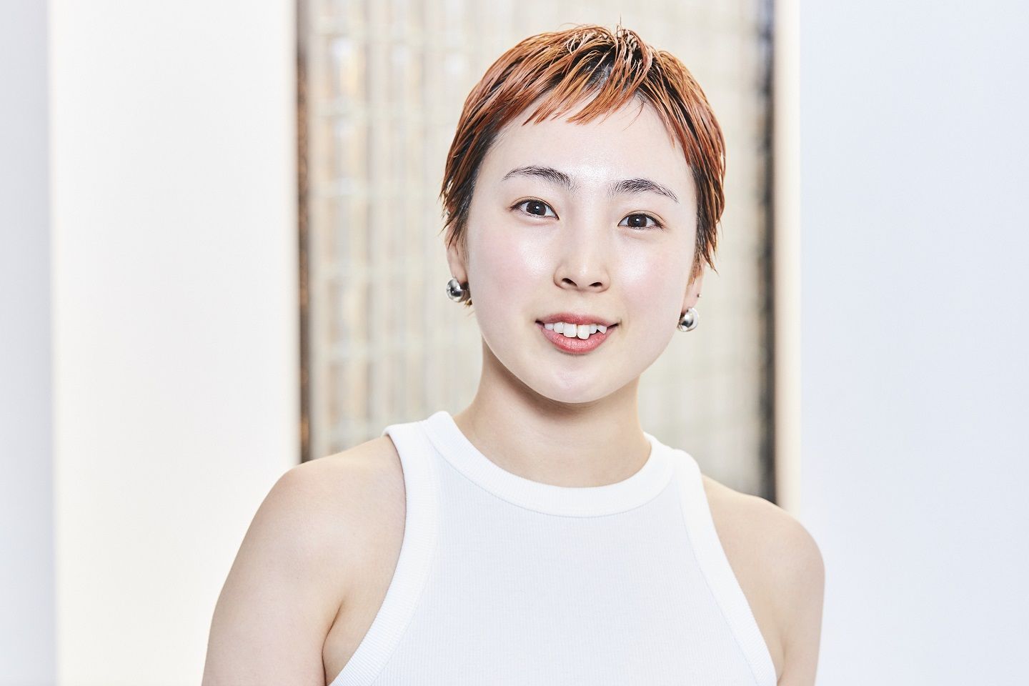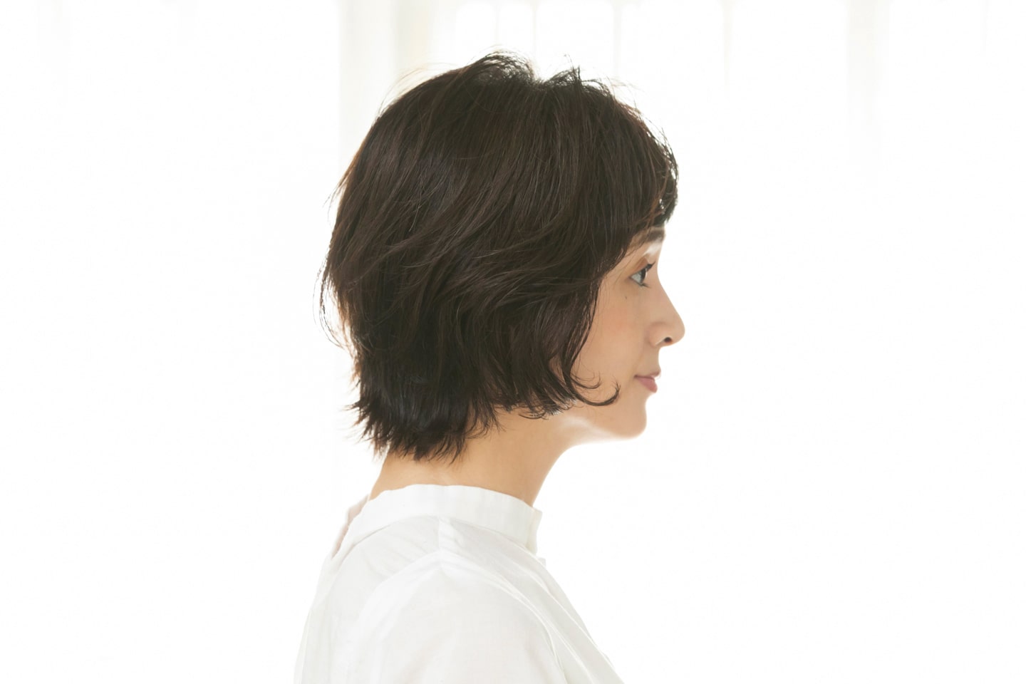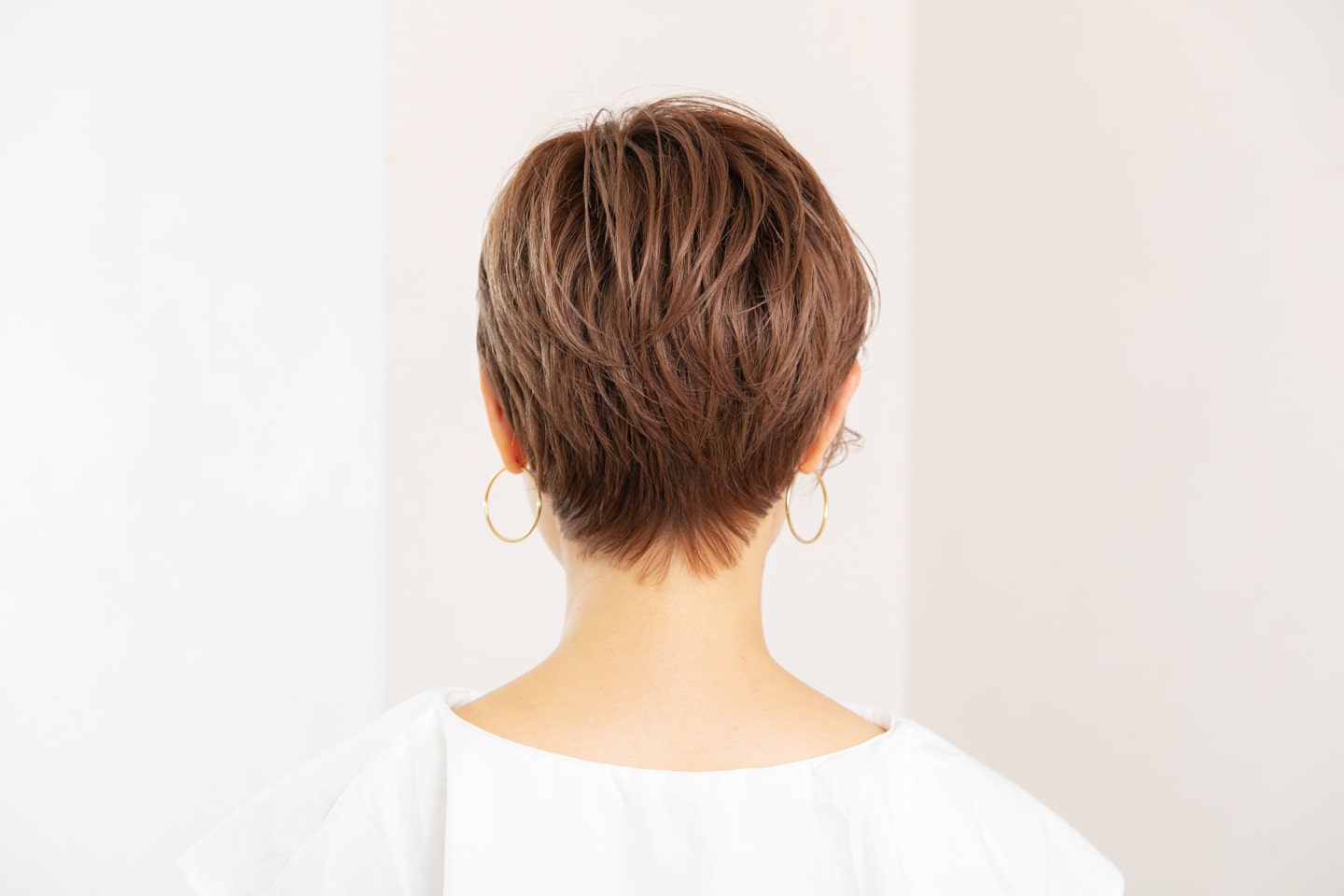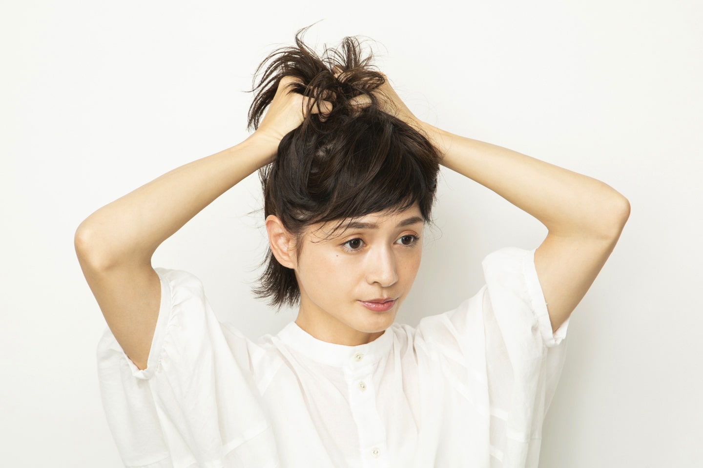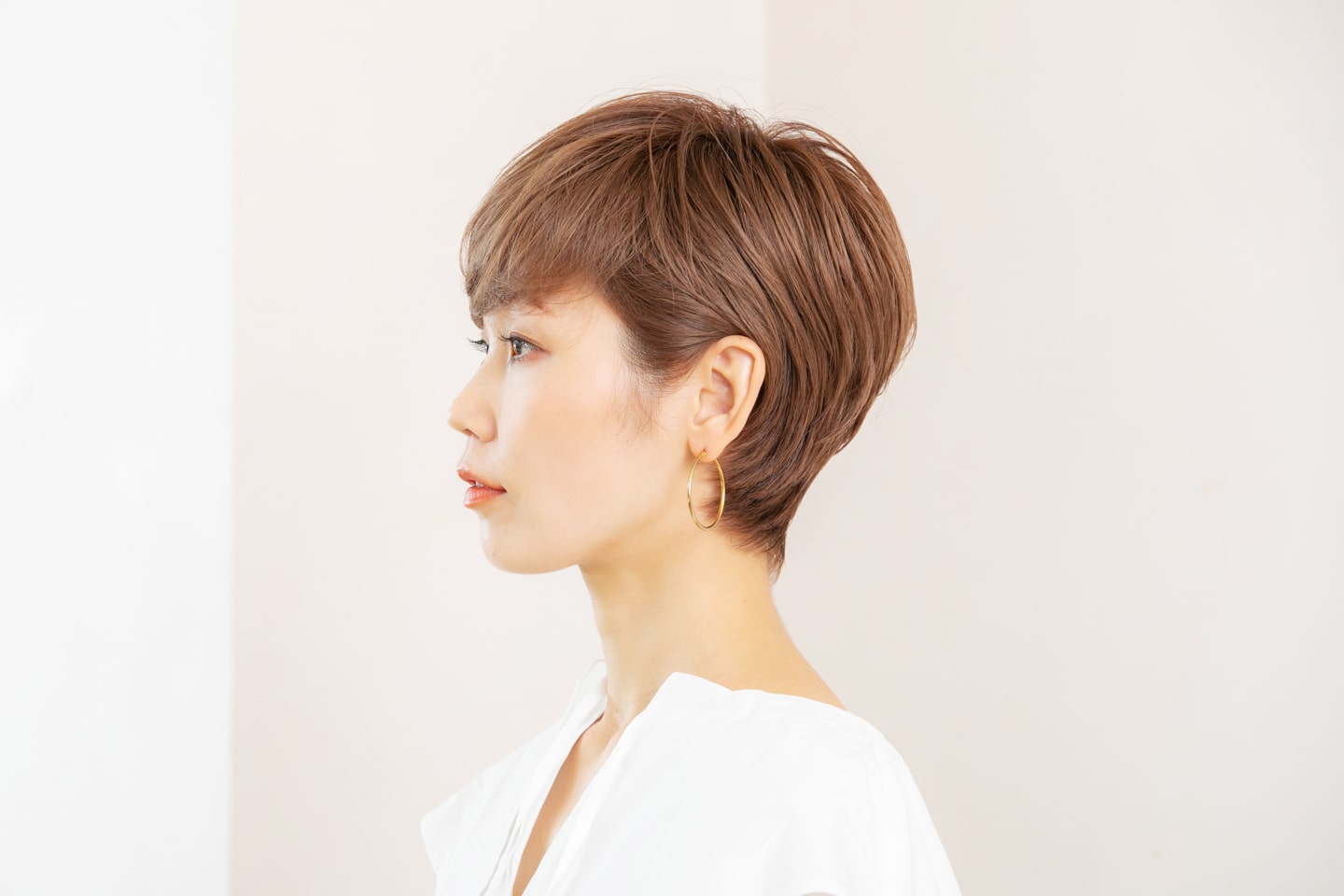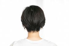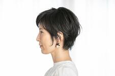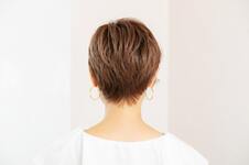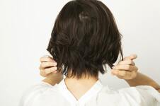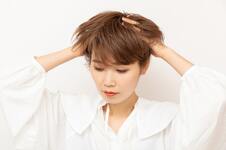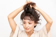 ミディアムワックスにオイルを1プッシュ加え、手のひらでのばす。スタイリング剤が髪の内側にしっかりつくように、下から手を入れて全体にまんべんなくなじませる。ふんわり整えて、前髪が短い方のサイドを耳にかけて完成。