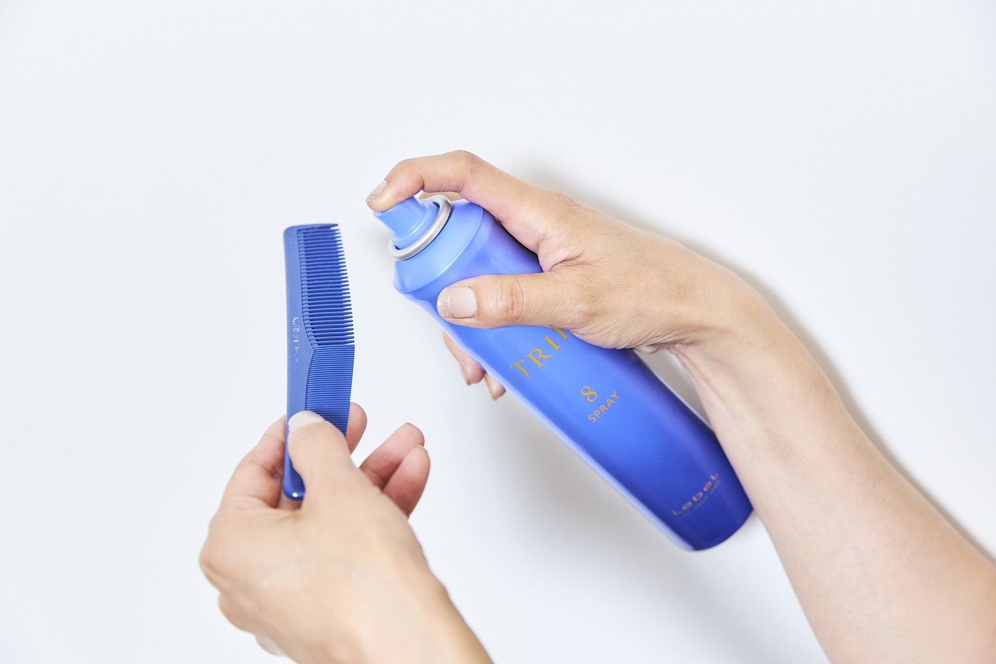 前髪の流れをキープするためのスプレーは直接吹きかけるのではなく、コーム使いがポイント。
