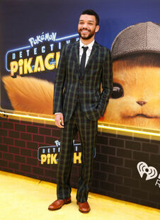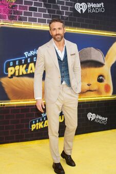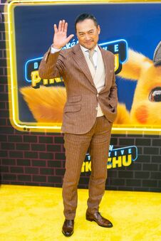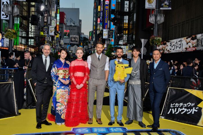 2019年4月25日、新宿区歌舞伎町で行われたワールドプレミア。左からロブ・レターマン監督、飯豊まりえさん、キャスリン・ニュートン、ライアン・レイノルズ、ジャスティス・スミス、竹内涼真さん、渡辺謙さん。飯豊さんと竹内さんは日本語吹替版で声優を務めた。