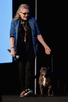 2016年8月21日、ローズモントのドナルド・E・ステファンズ コンベンションセンターで開催された「Wizard World Comic Con Chicago 2016」(当時のイベント名/現:FAN EXPO Chicago)のトークステージ。足元のフレンチ・ブルドッグは愛犬のゲイリー。