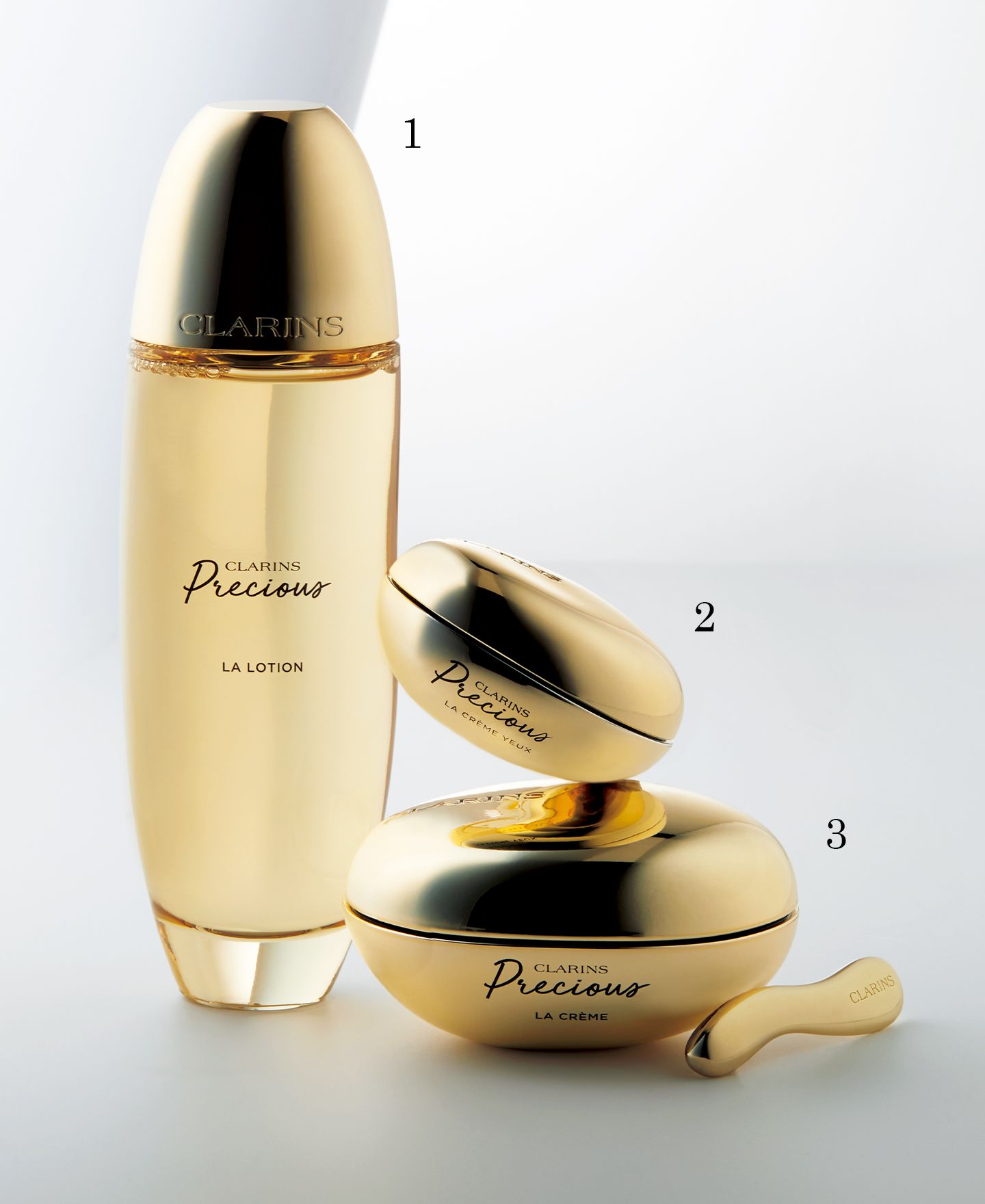 1.クラランスプレシャス ラ ローション 150ml ¥17,600、2.同 ラ クレーム ユー 15ml ¥22,000、3.同 ラ クレーム 50ml ¥46,200
