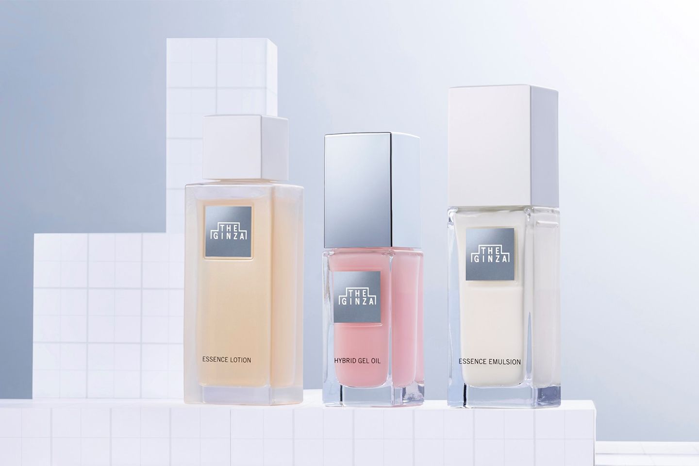 左から/ザ・ギンザ エッセンスローションn 95ml ¥12,100、同 ハイブリッドジェルオイルn 95ml ¥16,500、同 エッセンスエマルジョンn 75ml ¥13,750