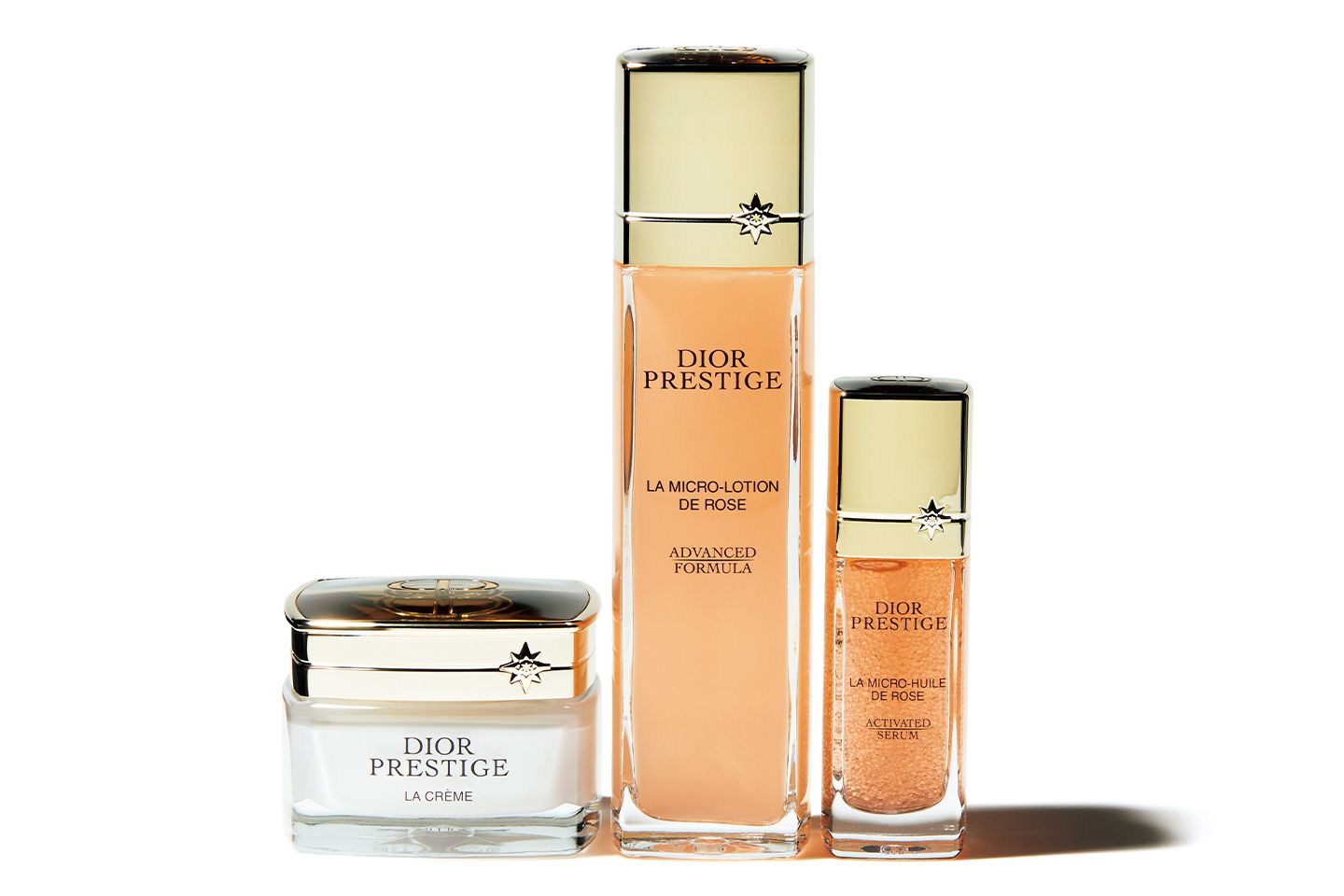左から/パルファン・クリスチャン・ディオール プレステージ ラ クレーム N 50ml ¥53,350、同 マイクロ ローション ド ローズ 150ml ¥20,900、同 マイクロ ユイル R セラム 30ml ¥34,650