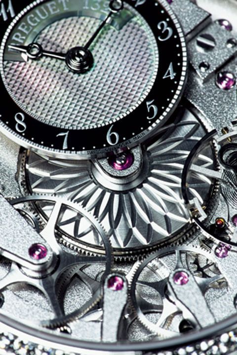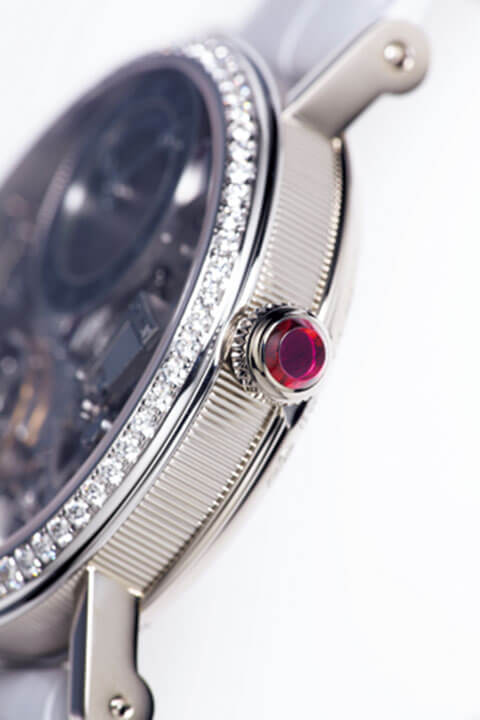 創業者ブレゲが製作した香箱を中央に、テンプと歯車をシンメトリーに置いた懐中時計をデザインコードにしたムーブメントが、目を引きます。香箱の上に、エングレービングしたマーガレットの花模様。こちらも女性のために施した、特別な細工なのです。