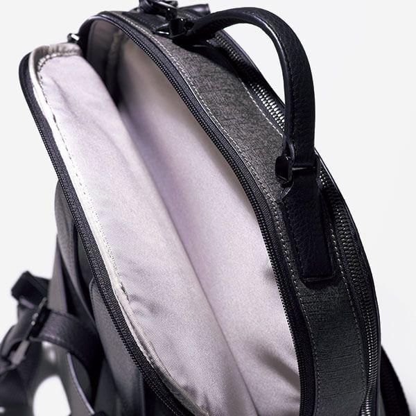 肩がけするだけでなく、トップハンドルを手にしてブリーフケース風にも持てる、マルチユースなバックパック。ストラップを使わないときには、キャリーハンドルを通せる、背面の幅広ベルトに収めることができるのも優秀。