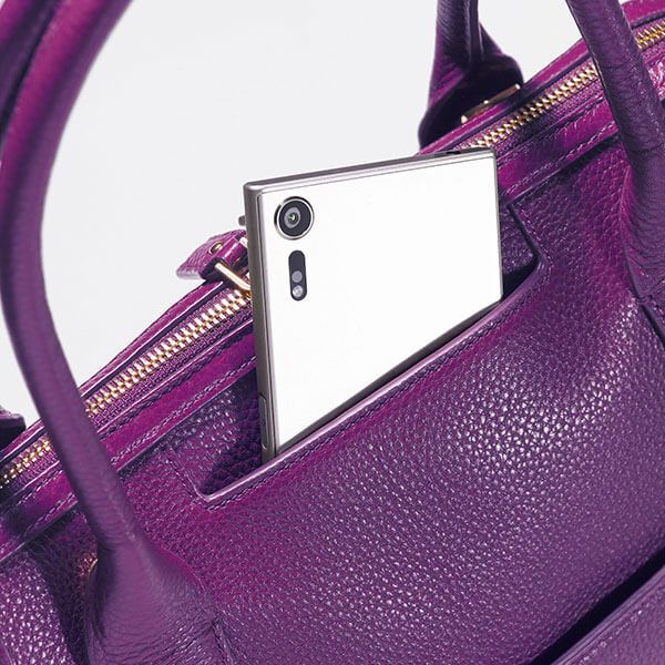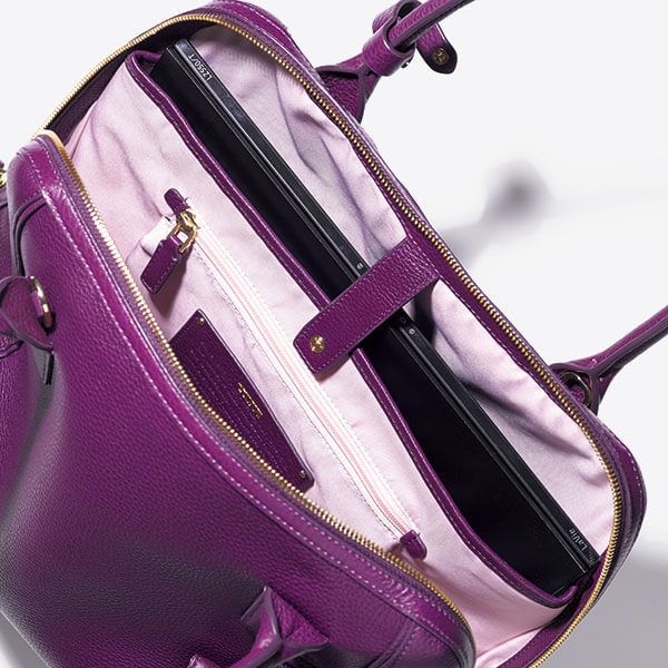 物を整理しやすく、取り出しやすいトートは、時間を有効に使いたい出張に最適。背面ポケットの内側のスリットに、キャリーのハンドルを通してふたつをしっかり固定できるのが、スマートな移動を叶える秘密。シーズンカラーの「マルベリー」(パープル系)で、いきいきとエレガントな印象に。