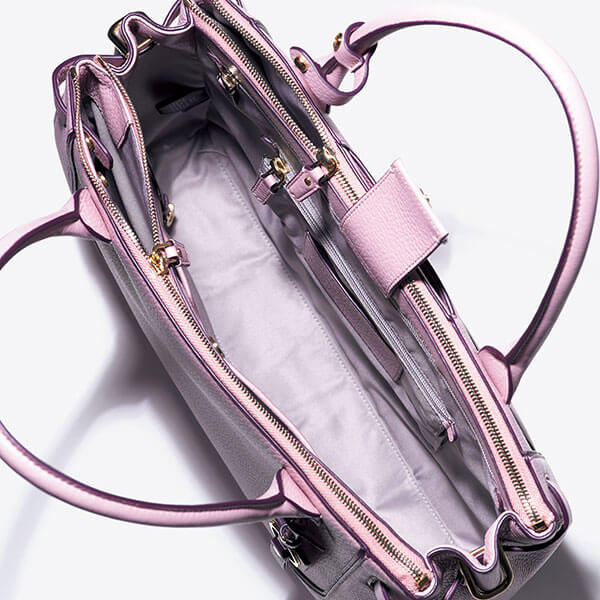 ソフトでしなやかなのに、丈夫なペブルレザー(しぼのある牛革)をシーズンカラーのピンクに染め上げた、ハンドバッグタイプ。仕事に必要なものをすっきり収納しつつも軽やかで、エレガントな印象を高めてくれます。
