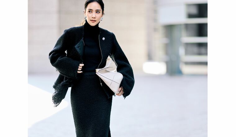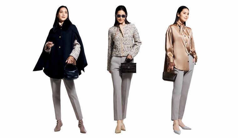 上品で柔和なベージュを黒で引き締め、しなやかさと力強さが共存した秋のモードエレガントス…