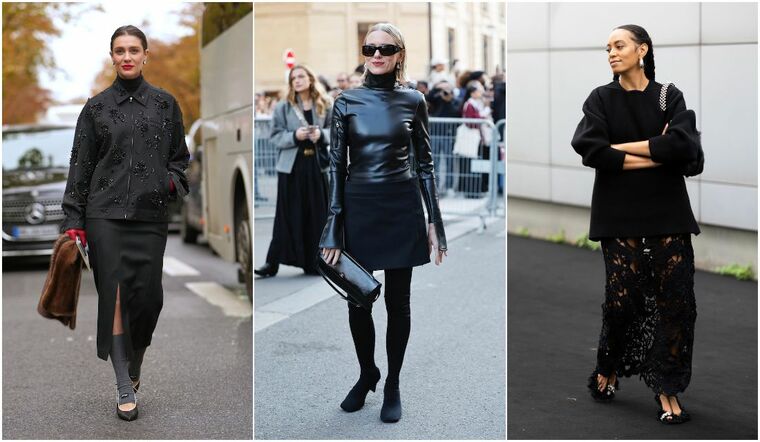フェミニンなスカートを、きりっとかっこいい黒一択の着こなしに加えると辛口エレガントなム…