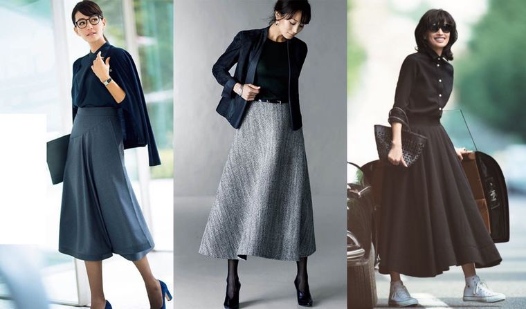 秋の大人のロングスカートコーデまとめ。黒ロングスカート、ベージュロングスカートの着こな…