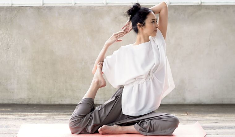 早朝の静かなスタジオで行うヨガには、ボディラインを拾わないオーバーサイズの白トップスを…
