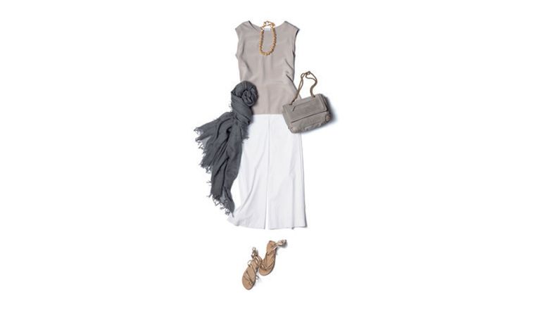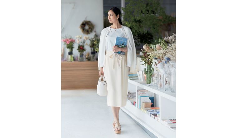 - ホワイト大人コーデ夏コーデTシャツスカートサンダル海外マダム&セレブスナップ