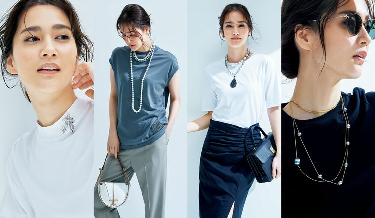 夏コーデTシャツパールネックレス小物ブレスレットパンツバッグスカートサングラスミキモトトッズミカコ ナカムラ